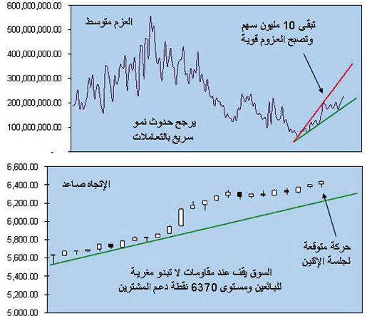جلسة الإثنين حساسة بسبب افتتاح أسواق النفط وبدء أسبوع جديد للأسواق الأجنبية لكن الأهم هو توقعات المتعاملين بشأن الموسم الثالث ويبدو أن عامل الزمن يتمرد بسبب قرب انتهاء الموسم وحسم التوقعات، أما من الناحية الفنية لا تبدو المناطق الحالية مغرية لأوامر البيع بسعر السوق ولا تتناسب مع نمو حجم التداول الذي يقف لصالح المشترين، ويرجح حدوث نمو سريع فيها إلى مستوى 288 مليون سهم، وبدمج حركة التداول لآخر 8 جلسات نحصل على الحركة المتوقعة للجلسة وتظهر إغلاق للسوق عند 6437 نقطة مع زيادة لمستوى 6444 نقطة استمراراً للاتجاه الصاعد.