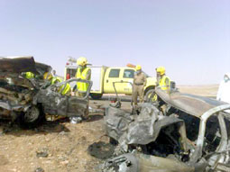 لقي أربعة أشخاص مصرعهم يوم أمس الأول في حادث مروري مروع بين سيارتين الأولى من نوع (كابرس) تقل رجلا وامرأتين والأخرى من نوع (دادسون) تقل شخصا واحدا وقع الحادث على بعد 120كم تقريبا على طريق حائل - المدينة بالقرب من محطة الشعبة الحديثة.. وعلمت «الجزيرة» انه لم تتمكن الأجهزة الأمنية من التعرف على هوية المتوفين لتفحمهم داخل السيارات.