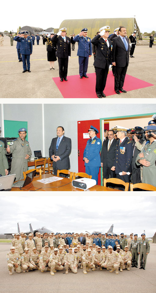 ثم توجه سموه إلى نادي ضباط القاعدة واستمع لكلمة ترحيبية من الفريق الأول الطيار جون بول بالوميثوز قائد سلاح الجو الفرنسي وتسلم سموه هديتين تذكاريتين من قائد سلاح الجو الفرنسي ومن قائد مجموعة القوات الجوية المشاركة في تمرين (الدرع الأخضر -2) العقيد الطيار الركن حامد بن رافع العمري.