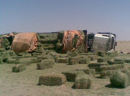 وكانت الشاحنة المحملة بمئات البلوكات من البرسيم قد انحرفت عن الطريق مما تسبب في فقدان السائق للسيطرة عليها وادي ذلك لانقلابها وتناثر حمولتها جوار الطريق.