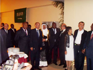 أقامت سفارة خادم الحرمين الشريفين لدى الجابون مؤخراً احتفالاً بمناسبة اليوم الوطني الـ 79 للمملكة في فندق اللايكو بالعاصمة ليبرفيل حضره كل من السيدة لور أولغا غونجو - وزيرة الإعلام والبريد والاتصالات وتكنولوجيا المعلومات الحديثة - والسيد سلفستير راتانجا - وزير النقل والطيران المدني - والسيد مارتان ما بالا - وزير الاقتصاد الجابوني والمياه والصيد - والسيد كليمانت ندونغ مبا - وزير المقاولات الصغيرة والمتوسطة والاقتصاد الاجتماعي ومكافحة الفقر - والسيد بول بوندوكو لاثا - وزير منتدب لدى رئيس الوزراء وزيرة البيئة وحماية الطبيعة والتنمية المستديمة - والسيد توماس دوبويون نزي - حاكم إقليم الإستوير (العاصمة ليبرفيل) والسيدة ريف كارولين أزيزبوما - سفيرة ومديرة التعاون الاقتصادي والمالي والتجاري بوزارة الشؤون الخارجية - والسيد علي أكبر - سفير الجابون المعتمد لدى المملكة - والسيد إسماعيل أوسيني نائب رئيس المجلس الأعلى للشؤون الإسلامية - والدكتور أبو بكر مينكومي نسيمي - الأمين العام للمجلس الأعلى للشؤون الإسلامية -.. كما حضر الحفل أيضاً سفراء الدول العربية والأجنبية ورؤساء المنظمات والهيئات والبنوك الدولية المعتمدة لدى الجابون وكذلك عدد كبير من رجال الأعمال والإعلام المسموع والمرئي والمقروء والجاليات العربية والإسلامية، وقد تمت تغطية المناسبة من قبل وسائل الإعلام الجابونية، كما تم توزيع المواد الإعلامية المختلفة التي تبرز ما وصلت إليه المملكة من نهضة وتطور على مختلف الأصعدة، وقد عبر الجميع عن تهنئتهم للمملكة قيادة وحكومة وشعباً بهذه المناسبة المجيدة متمنين للمملكة العربية السعودية دوام التوفيق والازدهار في ظل قيادة خادم الحرمين الشريفين الملك عبدالله بن عبدالعزيز -حفظه الله-.