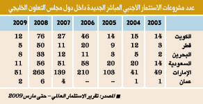 وقال التقرير: إن الاستثمار الأجنبي المباشر في دول مجلس التعاون الخليجي شهدت تدفقات الاستثمار الأجنبي المباشر العالمية الواردة انخفاضاً تاريخياً من أعلى مستوياتها على الإطلاق البالغة 1.979 مليار دولار خلال العام 2007 لتصل إلى 1.697 مليار دولار أمريكي خلال العام 2008, مسجّلة تراجعاً بنسبة 14.2 في المائة. وكانت الاستثمارات الأجنبية المباشرة في فترة ما قبل الأزمة الماليّة، تركز على الدول النامية والقطاعات التي يسهل فيها الحصول على الائتمان.. وعقب تفشي أزمة الائتمان في جميع أنحاء العالم، تحوّلت الاستثمارات الأجنبية المباشرة من الدول المتقدمة إلى الدول النامية والناشئة ومن ضمنها دول مجلس التعاون الخليجي.