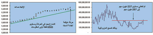 تفاعلت الجلسة مع عوامل خارجية مؤثرة بشكل مباشر في السوق حيث انخفض الدولار إلى مستوى 74,7 أمام سلة عملاته بسبب تحسن واردات وصادرات الصين لشهر سبتمبر أيضا تقرير أوبك الشهري رفع توقعاته على طلب النفط وساهم ذلك في ارتفاع الذهب إلى مستوى 1070 للأونصة كل ذلك عزز من مشتريات خامات النفط لتخطي 75 دولارا للبرميل تفاعلت معه سابك بارتفاع لأحجام التداول إلى 4.2 مليون سهم عند سعر 80.75 ريال وبشكل عام يبدو القطاع البتروكيماوي لا يرغب العودة مرة أخرى لمستوى 5086 نقطة بسبب قوة المشترين، أما المصارف كان نصيب أحجام التداول معظمه في مصرف الإنماء الذي مثل 20% من تعاملات السوق تفاعل معه سعريا بشكل منسجم، أما القطاع بشكل عام مستمر في صعوده ما لم يضعف أمام مستوى 17500 نقطة مستقبلا، واللافت أن بنك الرياض على الرغم من إيجابية نتائجه لم يشارك كثيرا في الجلسة لا سيما أن تعاملاته أعلى من متوسط 16 يوما لأحجام تداوله لكن لم يفلح في ذلك، وأخيرا نذكر بأن الإغلاق الأسبوعي عند 6449 نقطة يصب لصالح المشترين والاتجاه على مستوى الحركة اليومية لا يزال صاعدا أما العزوم فهي قوية لأول مرة منذ شهر مايو الماضي ما دامت فوق مستوى 237 مليون سهم.