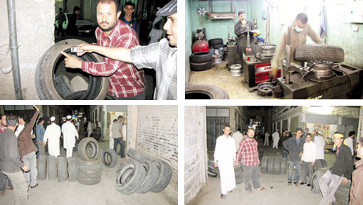 يتخفى في أحد أزقة حي الغرابي بالقرب من مجمعات زينة السيارات عدد من العمالة الذين يقومون بشراء الإطارات المستعملة، وذلك بمساومة مستبدل إطاراته القديمة من عند أصحاب المحلات، وعدسة الجزيرة تجولت في الممر الذي اتضح أنه مملوء بالمستودعات التي يخبئون فيها الإطارات المتهالكة بعد أن يقومون بتلميعها وترقيع ما تلف منها بطريقة احترافية، وبعدها يقومون ببيعها في حراج وسط حذر شديد من الرقابة، من جهته قال أحمد علي أحد الباعة إن هذه العملية تسهل على ذوي الدخل المحدود شراء طقم إطارات كامل بربع قيمة الإطارات الجديدة، وقال إنهم لا يشترون إلا إطارات تحمل تاريخ آخر سنتين من الصنع والذي يعتبر جديداً بحد قوله، وقال محمد إقبال أحد العمالة الشرق آسيوية إن عمله في هذا الممر يقتصر على فحص الإطارات داخل معمل قبل شرائها وهل هي صالحة للاستعمال أم لا حتى نمنح المشتري ضماناً لاستعمالها، وقال أيضاً إنه يوجد مشترون يقومون بتصديرها للمناطق الجنوبية في المملكة وذلك نظراً للأجواء الباردة في المنطقة.