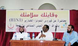 أقام المعهد المهني الصناعي بمحافظة المجمعة محاضرة عن فيروس إنفلونزا الخنازير (H1N1)، بالتعاون مع مركز صحي الفيصلية وقدَّم المحاضرة الدكتور صلاح بدر عبد الله. وتناولت المحاضرة التعريف بالفيروس وطرق الوقاية منه والتعامل معه، وتم توزيع مطويات توعوية متنوّعة عن الفيروس، وفي نهاية المحاضرة فتح المجال للأسئلة من الحضور، وشهدت المحاضرة تفاعلاً كبيراً خصوصاً من متدربي المعهد.