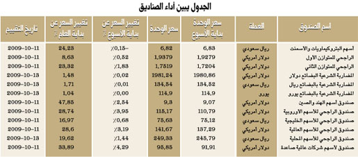 وبالنسبة لثاني أفضل الصناديق أداء نهاية هذا الأسبوع، فقد كان من نصيب صندوق الراجحي للأسهم الأوروبية التي تحولت هي الأخرى من الأداء السلبي خلال الأسبوع ما قبل الماضي إلى الأداء الإيجابي، حيث استطاع الصندوق أن يحول هبوط الأسبوع ما قبل الماضي إلى ثاني أفضل الصناديق صعوداً حيث حقق عائداً يقارب 3.95% ليرفع مستوى عائده منذ بداية العام إلى 28.74% بعد أن كان مستقراً 23.84% بتقييم 4-10-2009، كما تحول أيضاً من الأداء السلبي إلى الأداء الإيجابي صندوق الراجحي للأسهم العالمية حيث عوض انخفاضه المقدر بـ 1.88% إلى الارتفاع حيث حقق عائداً خلال هذا الأسبوع يقارب 3.19% وليرفع عائده المحقق منذ بداية العام من 24.63% إلى 28.6% بنهاية هذا الأسبوع. وفي السياق نفسه واصل صندوق الراجحي لأسهم الهند والصين تربعه على أفضل الصناديق عائداً منذ بداية العام حيث ارتفعت قيمة الوحدة لتصل بتقييم 11-10-2009 إلى 9.3 دولار أمريكي وليرفع نسبة العائد منذ بداية العام من مستوى 44.2% إلى 47.85% مشفوعاً بعائد هذا الأسبوع الذي وصل إلى 2.54%.