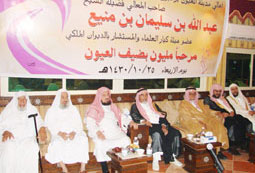 أُقيم يوم الأربعاء الماضي لقاء مفتوح بمعالي الشيخ عبدالله بن سليمان بن منيع عضو هيئة كبار العلماء المستشار بالديوان الملكي في جامع عمر بن الخطاب رضي الله عنه بمدينة العيون بالأحساء، وذلك بدعوة من الشيخ محمد بن سعود العمر مع المكتب التعاوني والدعوة والإرشاد وتوعية الجاليات بالعيون. وقدم اللقاء، الذي حضره جمع من طلبة العلم والمهتمين، خالد حمد السليم، وقدم الشيخ عبدالله بن منيع كلمة نصح وتوجيه، ثم تفضل بالإجابة عن أسئلة واستفسارات الحضور من الرجال والنساء. وفي ختام اللقاء تم تكريم الشيخ المنيع والمكتب التعاوني على دوره في دعوة العلماء للاستفادة من علمهم وتوجيهاتهم.