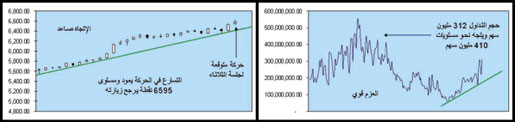 بعد انتهاء النتائج المالية للربع الثالث التي كانت بالمجمل عند التوقعات عادة ما ينقسم المستثمرون إلى قسمين، الأول يبني توقعاته على نفس نسق النمو في فصول هذا العام بداية من الربع الأول حتى الثالث ويستبق نتائج الربع الرابع بخفض حصصه أو زيادتها، أما القسم الثاني (المتحوط) لا يرغب في المفاجآت في النتائج المالية أو ارتفاع التضخم من جديد في الاقتصاد فيركز على تحقيق الأرباح الرأسمالية من عملية التذبذب السعري وهذه المهمة بحاجة إلى جرأة في اقتفاء أثر المقاومات التاريخية، تجلى ذلك من ارتفاع حجم التداول للجلسة إلى 312 مليون سهم وتظهر عزما قويا فوق المتوسط وبإغلاق السوق عند 6535 نقطة تم ابتلاع جلسات البيع الماضية بمعروف من سهم سابك الذي أغلق عند 84 ريالا وبحجم تداول عال يقارب 17 مليون سهم يضع قطاعه فوق مستوى 5499 نقطة أما الأبرز كان تخطي قطاع الاتصالات مستوى المقاومة 1940 نقطة وبذلك تكون معظم القطاعات القيادية على الأقل تميل لاستمرارية الصعود، وتنتهي الجلسة معلنة استمرار الاتجاه الصاعد وبعزم قوي متجدد كما هو موضح في الرسم البياني.