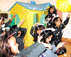 مجموعة من الطالبات في إحدى مدارس الرس في فقرة ترفيهية خلال الأسبوع التمهيدي. |