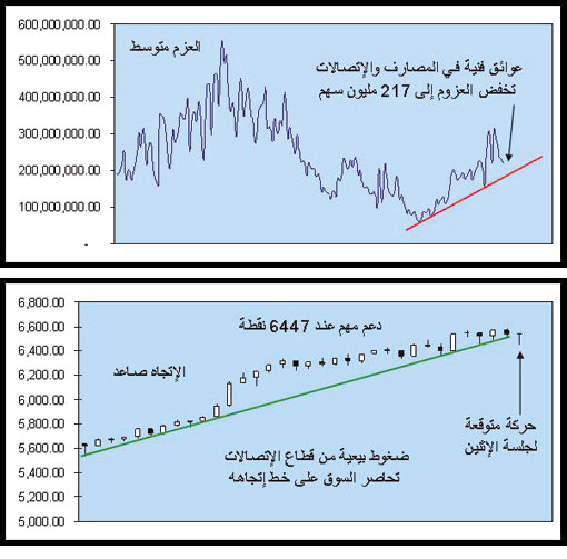 أعلنت هيئة السوق المالية عن عودة أنعام للتداول المستمر من الأربعاء القادم بعد تحقيقها أرباحا تشغيلية لعامين متتاليين وهذا بمثابة عفو من السوق لسهم له تاريخ طويل في التداول لكن هذه المرة عادت لتجدد شبابها، نعود للسوق حيث ما زال التعاقب مستمرا للجلسات الأخيرة بين البائعين والمشترين لكن في مسار صاعد حتى الآن وما حدث في هذه الجلسة من بيوع كانت طفيفة أي لا تظهر قوة بيع لأنها تزامنت مع حجم تداول 217 مليون سهم، وهي منخفضة كما هو مبين في الرسم البياني، والسبب جاء من المشاكل الفنية التي يواجهها قطاعا المصارف عند 17500 نقطة وبين الاتصالات وتقنية المعلومات عند 1940 نقطة، وتمثل مقاومات وهي أقرب للتأسيس من التصريف، هذا ضغط على المؤشر العام وجعله يفرط في اختبار دعومه ومقاوماته وكأنها منطقة تفتيش للتأكد من ميزان قوى البيع والشراء وأين يمكن ترجيحه حيث أغلق السوق فوق خط الاتجاه الصاعد عند 6527 نقطة والعزوم لا تزال معتدلة حتى الآن.