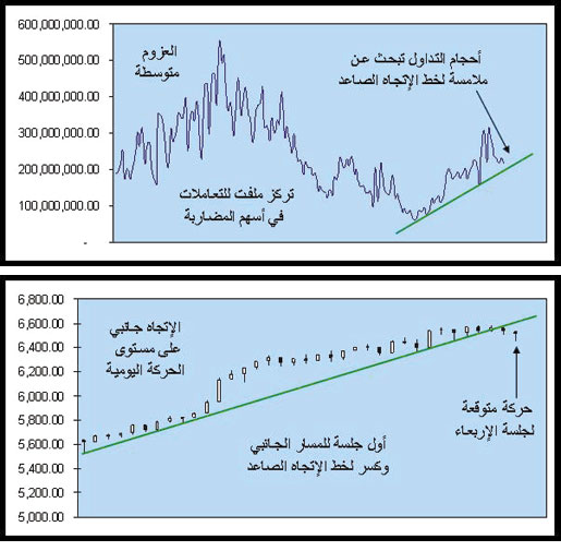 جلسة الأربعاء ستكون العوامل الخارجية حاضرة فيها خصوصا حركة الدولار والذي يحاول حاليا تنشيط أسعاره أمام العملات الرئيسية مع توقعات بإمكانية رفع أسعار الفائدة في أمريكا ولا سيما أن نتائج الموسم الثالث كانت في أمريكا عند التوقعات بالمجمل، لذا سيكون المسار الجانبي هذه المرة يتسم بتذبذبات حادة وبانتظار إغلاق أسبوعي يرجح أن يكون فوق خط الاتجاه الصاعد على مستوى الحركة اليومية، وبدمج حركة التداول لآخر 20 جلسة يظهر لدينا شمعة بيعية بعزوم متوسطة ما لم نتجاوز مستوى 237 مليون سهم في الجلسة والإغلاق يمكن أن يكون قريبا من 6506 نقاط على الأرجح.