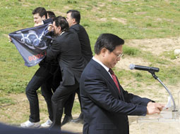 مسؤول صيني يلقي خطاباً قبيل انطلاق الألعاب الأولمبية غير مبال بما يجري خلفه مع أحد المتظاهرين الموالين لجماعة التيبيت، الذي حاول الهجوم عليه قبل أن يلقي الحرس القبض عليه في شهر مارس من عام 2008م.