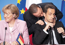 رئيس الوزراء الإيطالي سيلفيو بيرلسكوني يوشوش في أذن الرئيس الفرنسي نيكولاس ساركوزي (بقوة)، وفي الجوار المستشارة الألمانية أنجيلا ميركيل تبتسم أثناء مؤتمر صحفي لمناقشة الأزمة المالية الدولية في أكتوبر عام 2008م.