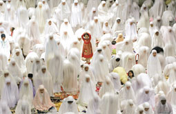 عشرات الإندونيسيات يؤدين صلاة التراويح في أحد المساجد بجزيرة جاوة الإندونيسية في أول أيام شهر رمضان المبارك من عام 2008 بينما تبدو طفلة وسط الجموع واقفة بالقرب من والدتها.