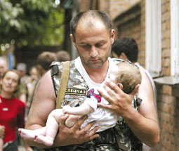 شرطي روسي يحتضن رضيعة بعد تحريرها من جماعة مسلحة احتجزت مجموعة من الرجال والنساء داخل مدرسة في مدينة بيسلان قرب الشيشان في سبتمبر 2004 .
