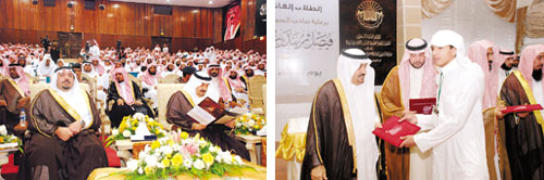 ثم تفضل راعي الحفل صاحب السمو الملكي الأمير فيصل بن بندر بتكريم الطلاب الفائزين ومجمعات الحلق والأساتذة، كما كرم سموه مدير عام الجمعية السابق د. سليمان السعود لجهوده التي بذلها طيلة عمله.