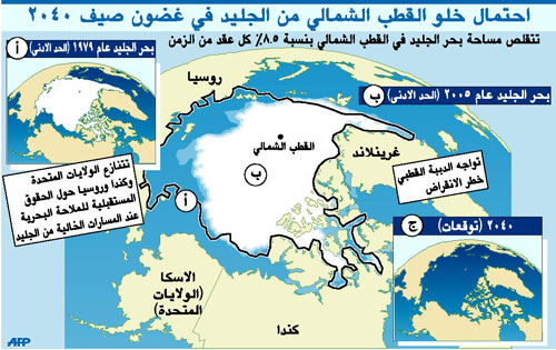 قال خبير في القطب الشمالي إن طبقة الجليد التي تكونت على مدى سنوات عديدة وكانت تغطي المحيط المتجمد الشمالي تلاشت بالفعل وهو تطور مذهل يسهل فتح ممرات للملاحة البحرية في القطب الشمالي. وأعاقت المساحات الهائلة من الجليد المتعدد الطبقات الذي يتعذر اختراقه وقد يبلغ سمكه 80 متراً لقرون مرور السفن التي كانت تسعى لطريق مختصر من المحيط الأطلسي إلى المحيط الهادي عبر الممر الشمالي الغربي الأسطوري.. كما استبعدت فكرة الملاحة عبر قمة العالم.