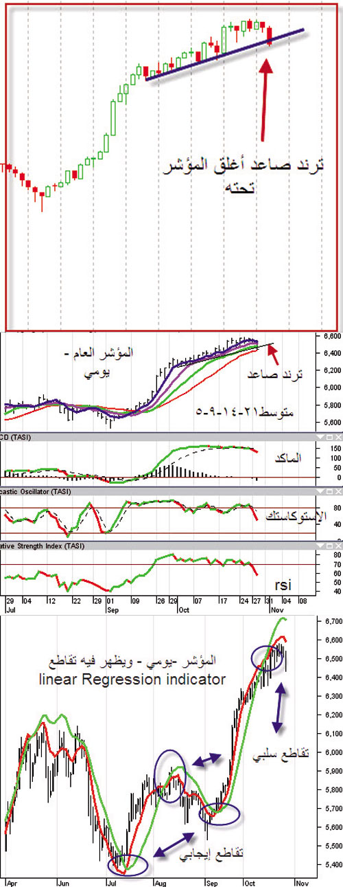 كون المؤشر خلال (عشرين يوما تداول) سابقة ترندا صاعدا بدأ من نقطة 6239 والتي منها صعد المؤشر حتى أعلى نقطة لامسها صعودا 6578 ومنها تراجع ليكسر الترند الصاعد الذي كان دعما قويا لهذا الصعود خلال الأيام الماضية؛ ومن الرسم البياني المرفق يتضح الترند الصاعد الصغير ويتضح كسرخط الترند ليغلق المؤشر تحته وبهذا يتحول خط الترند إلى مقاومة بعد أن كان دعما وقد يظل المؤشر في سلبيته على المستوى القصير حتى يتجاوز خط الترند صعودا.