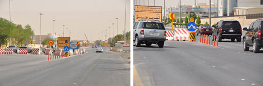 وحرصاً من الهيئة العليا لتطوير مدينة الرياض على سلامة سالكي الطريق فقد سعت إدارة المشروع إلى استخدام المواصفات والمعايير العالمية لإدارة الحركة، من ضمنها الحواجز الخرسانية لتحديد مسارات الحركة المرورية, حيث تم دهان هذه الحواجز بلون عاكس للإضاءة وإحاطتها بإضاءة ملونة بهدف لفت انتباه قائدي المركبات لأخذ الحيطة والحذر وترتيبها بحيث تكون المسافة الفاصلة بين حاجزين متتاليين متراً واحداً عندما يكون الطريق مستقيماً، وأما عند الانعطافات وخطوط الدوران فتلغى المسافة الفاصلة بين الحاجزين المتتاليين بحيث تكون الأطراف متلامسة مع تأمين الفواصل بينهما بشبك أو حاجز بلاستيكي لتأمين السلامة للمشاة وتأمين منطقة العمل.