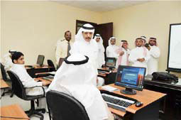 وتجول معاليه في معمل الحاسب الآلي، ومعمل اللغة الإنجليزية مستمعاً إلى شرح عميد الكلية الدكتور قاسم الحربي الذي أوضح أن المعمل يتسع إلى ما يقارب 70 طالباً، وهو مجهز على أعلى المواصفات وأحدث البرامج، ومن ذلك جاهزية المعمل لإجراء اختبارات التوفل بالتنسيق مع مركز اختبارات التوفل في المملكة، وتتم الدراسة به عن طريق مناهج إلكترونية ولا يعتمد على المذكرات أبداً، وسينطلق العمل فيه مع بداية العام الهجري القادم.