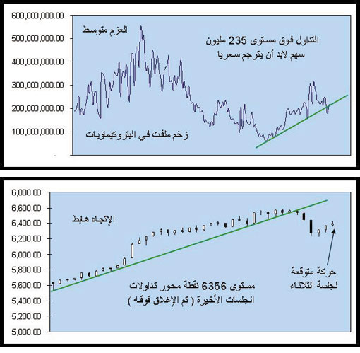 جلسة الأحد والاثنين كانتا محاولات جيدة لمحو الآثار السلبية لبيوع يوم السبت ويبدو بأن البائعين إما أنهم اكتفوا بمبيعات ذلك اليوم أو أن ذلك بمثابة ترقب لما يفعله المشترون الآن، لكن محور تداولات الجلسات الثلاث الأخيرة عند مستوى 6356 نقطة وهي ما سيحسم ميزان القوى، ولوحظ دعم من قطاع البتروكيماويات وهو الأسرع ارتداداً من بين القطاعات السبب الأول فني حيث لم يكسر دعما مهما بل تراجع من مقاومة قوية (5592 نقطة) والسبب الثاني تماسك أسعار خامات النفط عند 77 دولارا للبرميل، لكن بقية القطاعات كانت متواضعة في الشراء حتى مع ضعف البيوع، وبذلك أغلق السوق بشكل جيد عند 6371 نقطة معلنا استمرار الاتجاه الهابط على مستوى الحركة اليومية أما العزوم كانت متوسطة حيث بلغت 219 مليون سهم دون المتوسط العام.