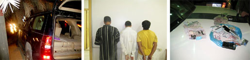 وبتفتيش الأشخاص عثر على مبالغ كبيرة وكميات من مادة الحشيش المخدر، كما وجدت في المكان الذي كانت تقف فيه السيارة ماكينة محاسبة (كاشير) مهشمة.