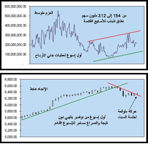 جلسة السبت والأسبوع القادم بشكل عام سيكون للعوامل الأساسية كالنفط والدولار والعوامل الفنية ممثلة بعواطف المتعاملين دور كبير وتكامل فيها، فعلى مستوى أحجام التداول يظهر الرسم البياني أنها موعودة بنطاق تذبذب جديد يمتد من 154 إلى 312 مليون سهم، وهي عزوم متوسطة قد نشهد فيها المزيد من الصراع بين المشترين والبائعين تماما مثل الأسبوع الماضي وبقيادة سهم سابك حيث أبرز دعومه 74 ريالا وأبرز مقاوماته 84 ريالا، ويظهر الرسم البياني الحركة المتوقعة لجلسة السبت، وذلك بعد دمج حركة التداول لآخر 12 جلسة يرجح أن يكون الإغلاق عند 6356 نقطة بعد زيارة لمستوى 6381 نقطة ونذكر بأن الاتجاه على مستوى الحركة اليومية لا يزال هابطا.