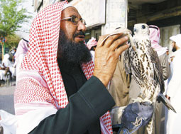 تاجر طيور يعرض أحد الصقور في سوق الطيور في الرياض علماً بأن ثمن الصقر يتراوح بين مائة إلى مليون ريال.