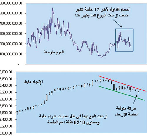 جلسة الأربعاء تمثل إغلاقا أسبوعيا مشابها لحركة تداولات ما قبله والتي توصف بالغربلة بعيدا عن العوامل المؤثرة الخارجية على الرغم من إيجابيتها في أسعار النفط والمنتجات البتروكيماوية، وفيها يرجح أن تكون العوامل الفنية متمثلة بسلوك المتعاملين هي من سيحرك نقاط المؤشر العام، ونلاحظ من خلال الرسم البياني الحركة المتوقعة لجلسة اليوم والتي تم الحصول عليها بعد دمج حركة التداول لآخر 9 جلسات يرجح أن يكون الإغلاق عند6210 نقطة بعد زيارة لمستوى 6139 نقطة تظهر استمرار عمليات الضغط الضعيف لصفقات البيع، أما الاتجاه نذكر بأنه لا يزال هابطا وبعزوم معتدلة؛ حيث يرجح أن تحظى الجلسة بحوالي 205 ملايين سهم.
