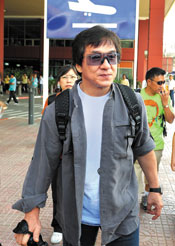 الممثل الصيني جاكي شان لحظة وصوله إلى مطار كمبوديا الدولي للمشاركة في مهرجان جسور- حزارات نحو ثقافة السلام والتي تقيمها منظمة السلام العالمي بالتعاون مع الفائزين بجوائز نوبل للسلام.