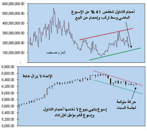 انتهى الأسبوع بفقد ما يقارب 77 نقطة مع تراجع في أحجام التداول بنسبة41% عن الأسبوع الذي يسبقه، كان التردد والترقب سمة من هو خارج السوق، والعزوف عن البيوع القوية لمن اشترى في شهر أكتوبر، تجلى ذلك من عدم جرأة المؤشر العام من زيارة مستوى 6139 نقطة واكتفى بارتداد في هذه الجلسة من مستوى 6196 نقطة وبأحجام تداول ضعيفة قرابة 147مليون سهم، كان الاتجاه هابطاً طيلة الجلسات وبعزم متوسط على مستوى الخمس جلسات الأخيرة، حتى سهم سابك تمسك بدعمه الحالي عند 80.25 ريال وسط تدني جرأة البائعين فيه من كسر دعوم هامة، أما قطاع المصارف بإغلاقه عند 16470 نقطة يظهر إنعكاسا وشيكا في الإتجاه ورغبة في مقاومة البيوع فيه بعد تحقيق قاع لحجم تداوله في الأسبوع عند 19 مليون سهم، وبذلك ننهي ثلاثة أسابيع هابطة لا يمكن تصنيفها إلا ضمن حدود عملية جني الأرباح، حتى العوامل الخارجية لم تسهم في قيادة التعاملات على الرغم من إيجابية أسعار النفط حيث كان الأسبوع بقيادة سلوك المتعاملين بامتياز.