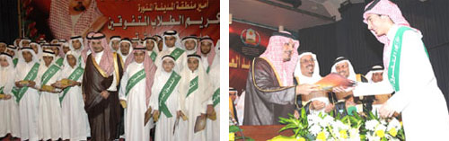 وأشار سموه إلى تميز الجهود الكبيرة للوزارة والتي تقطف ثمارها هذا المساء من خلال تفوق ثلة من أبناء المنطقة وحصولهم على العلامات العالية والمقدرة، وبارك سموه لأولياء أمور الطلاب على ما حققه أبناؤهم، ومشيداً في ذات السياق بدور مديري المدارس المتميزة على الجهد التطويري والرؤية التي أثبتت جدواها من خلال تميز هؤلاء الطلاب.