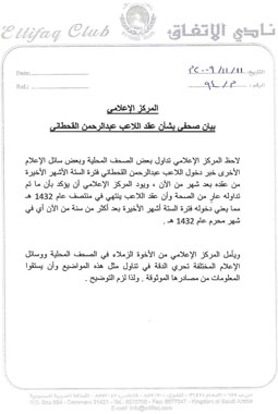 نفى نادي الاتفاق أن يكون لاعب فريقه الأول لكرة القدم عبدالرحمن القحطاني سيدخل فترة الستة أشهر بعد شهر من الآن قبل انتهاء عقده الاحترافي. وأوضحت عبر بيان رسمي صدر من المركز الإعلامي أن عقد اللاعب ينتهي في منتصف عام 1432هـ مما يعني دخوله فترة الستة أشهر الأخيرة في شهر محرم من السنة ذاتها. وطالبت الإدارة الاتفاقية وسائل الإعلام المختلفة بضرورة تحري الدقة واستقاء المعلومة من مصدرها الرسمي.