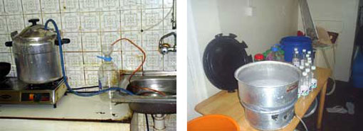 وتمت مداهمة الشقة وتم الكشف عن جالونين بسعة 22 لتر لكُل واحد وتشبه الجوالين التي يتم وضعها على برادات المياه كانت مليئة بالعرق المُسكر كما عُثر على 8 عبوات من سعة 5 لتر بالإضافة لمستلزمات التصنيع من مركبين غاز وقدور ضغط وليات ومواسير نحاسية وبعض عبوات الخمائر الفورية.