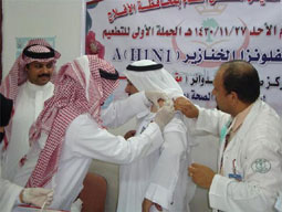 دشن مدير مستشفى الأفلاج العام عبد الله بن عبد الرحمن الحيدري انطلاق الحملة الوطنية الأولى للتطعيم باللقاح المضاد لفيروس إنفلونزا الخنازير H1N1، حيث بادر بأخذ التطعيمة الأولى في الحملة التي تشمل حجاج بيت الله الحرام والعاملين في القطاع الصحي بالمحافظة، والتي بدأت في مبنى المركز الصحي بحي الدوائر في ليلى بحضور المسؤولين في المستشفى والمراكز الصحية. وأوضح الحيدري ل(الجزيرة) أن هذه المرحلة من الحملة ستشمل تطعيم طلبة المدارس في جميع المراحل بعد استئناف الدراسة عقب إجازة عيد الأضحى المبارك وبشكل اختياري للجميع.