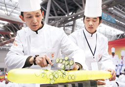 إمعاناً وإثباتاً لدقة هذا الشيف الصيني فقد فضل أن يقطع الخيار بسكين حادة على بالونة في مسابقة نظمتها الحكومة وشارك فيها 500 طباخ صيني |