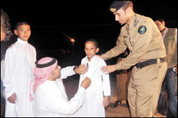 ووزع سراج سند الثياب على الأطفال والشبان بمساعدة إدارة الدفاع الذي مثّله النقيب يحيى القحطاني والملازم مصلح الغامدي. من جانبه أوضح مدير جمعية أحد المسارحة الخيرية التي تتولى توزيع الثياب على مستحقيها من النازحين، أحمد قشيش أن الواجب الديني والوطني يدفع جميع أفراد المجتمع إلى تقديم المساعدة المعنوية والمادية للنازحين. يشار إلى أن خطة توزيع الثياب على ثلاث دفعات في كل مرة يوزع 400 ثوب.