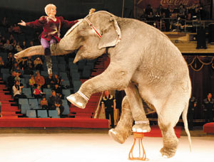 مدربة الحيوانات الروسية تاتينا فيلتوفا مستقرة على خرطوم فيل يقف على يد واحدة في عروض للسيرك بالمدينة السيبيرية كراسنويارسيك الروسية |
