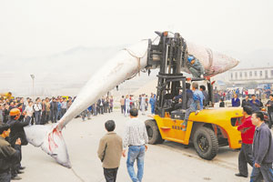 صورة التقطها مصور وكالة رويترز للأنباء في التاسع عشر من مارس الماضي لحوت ضخم نافق وزنه فاق العشرة آلاف كيلو جرام فيما سبب موته محيرا للعلماء الصينيين، وبثت الوكالة الصورة ضمن مجموعة من أبرز صورها لعام 2009 والذي يدخل اليوم شهره الأخير. |