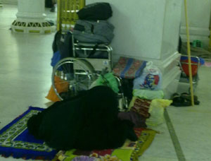 أم مصطفى لا تتبع أي حملة؛ فهي مقيمة في الحرم، جاءت قبل شهر وعشرين يوماً، فقد وضعها ابنها بعد أن أدت العمرة، وعاد لعمله وزوجته بالرياض. تقول: أنا بقيت في بيت الله الحرام، واخترت هذا العمود لأقيم وراءه؛ لأنه يسترني قليلا حين أنام وأجلس.