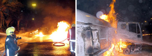 وقد هرعت فرق الدفاع المدني والمرور إلى موقع الحادث وتم إغلاق الطريق بواسطة المرور وإخماد النيران خلال (ساعة ونصف الساعة) بمشاركة أكثر من ثماني فرق من الدفاع المدني و(64) رجل إطفاء .