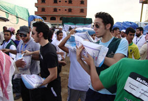 وقد قام أكثر من 100 شاب بتوزيع المعونات على المتضررين في تلك المنطقة التي شهدت أسوأ أضرار جراء السيول بمحافظة جدة، حيث تم توزيع 2400 سلة غذائية وكميات من المراتب والمخدات والسجاد.