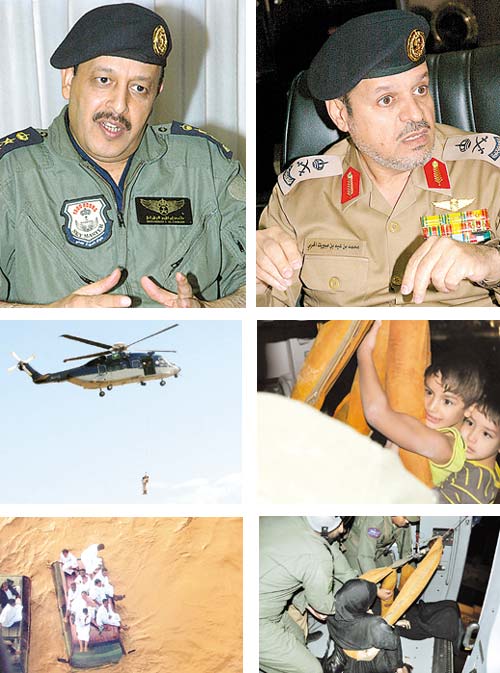وبين اللواء طيار محمد الحربي بأنه وخلال عمليات الانقاذ صادفتنا مواقف كثيرة لبعض المواطنين لنذكر منها الاطفال وخوفهم ورهبتهم من الطائرات عند محاولة الانقاذ وعدم استجابتهم للصعود إلى الطائرة الا اننا استطعنا بفضل الله ان نتغلب على تلك الصعاب وإجلائهم من المواقع. كما صادف الطيارون عدة مخاطر وصعوبات عند محاولة انقاذ المحتجزين حيث تمثلت تلك المخاطر في عدم استطاعة نزول الطائرة إلى موقع قريب بسبب أبراج الهوائيات الممتدة في الهواء وبعض أسلاك الكهرباء للضغط العالي فيما كانت المشكلة الكبيرة التي كانت عائقا كبيرة لنا هي تطاير لاقطات الستلايت الخاصة بالتلفزيونات من على المنازل بفعل الهواء الصادر من مراوح الهيلوكوبتر مما قد يسبب تطاير تلك الصحون إلى إصابة الأفراد المراد إنقاذهم.