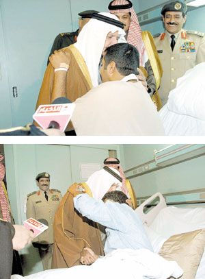 انطلاقاً من حرصه -حفظه الله- واهتمامه بأبنائه ضباط وأفراد القوات المسلحة الذين يضحون بأنفسهم في سبيل الذود عن الوطن وفي ملحمة وطنية تؤكد متانة تلاحم القيادة والشعب استهل صاحب السمو الملكي الأمير سلطان بن عبدالعزيز ولي العهد نائب رئيس مجلس الوزراء وزير الدفاع والطيران والمفتش العام أولويات سموه بعد عودته إلى أرض الوطن بزيارة مساء أمس لأبنائه ضباط وأفراد القوات المسلحة الذين يتلقون العلاج حالياً في مستشفى القوات المسلحة بالرياض إثر تعرضهم لإصابات أثناء أدائهم الواجب في تطهير الحدود الجنوبية للمملكة من المتسللين المسلحين.
