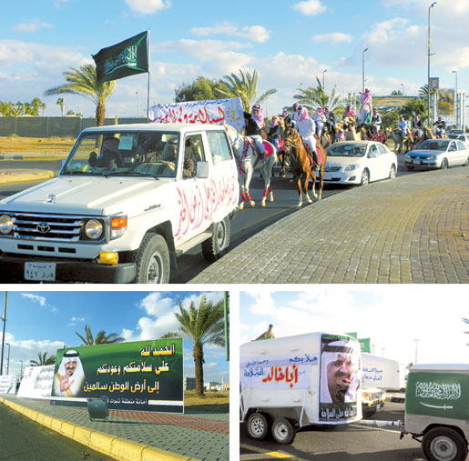 احتفى أهالي منطقة تبوك بوصول ولي العهد نائب رئيس مجلس الوزراء وزير الدفاع والطيران والمفتش العام الأمير سلطان بن عبدالعزيز لأرض الوطن سالماً معافى بعد الرحلة العلاجية التي كان بها حيث خرجت مسيرات السيارات والخيول مزينة بصور سلطان الخير تطوف شوارع تبوك شارك فيها العشرات من أبناء المنطقة كما ازدانت شوارع وميادين وطرقات مدينة تبوك بلافتات الترحيب.