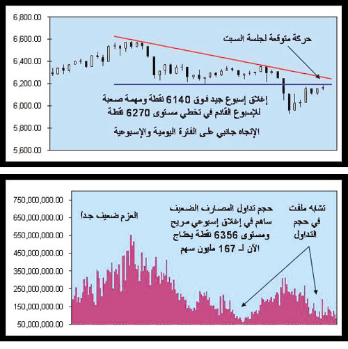 جلسة السبت السوق فيها موعود بعوامل خارجية تكون إيجابية إذ أعلن عن انخفاض في مخزونات الطاقة الأمريكية يترافق معه هبوط للدولار أمام سلة عملاته وهو متوقع، والأمر الآخر هو تنشيط أحجام التداول من قبل المضاربين حيث مع السيولة الباردة الاستثمارية لا بد من سيولة ساخنة تعيد النشوة للسوق خصوصاً في الأسهم المتوسطة والصغيرة، دليل ذلك هو تماسك العديد منها عند متوسط 200 يوم لكثير من الأسهم المضاربية، ويظهر الرسم البياني لحجم التداول أن زيارة قيعان مارس الماضي والتي تمتد من 60 إلى 95 مليون سهم كان بسلوك مشابه لشهر رمضان خصوصاً قطاع المصارف حيث حركة تداولاته تظهر نمطاً سبق تكوينه في المؤشر العام دليل على أن المصارف كانت متأخرة في حركتها مع السوق، وبدمج حركة التداول لآخر 33 جلسة يرجح أن يغلق السوق عند 6167 نقطة بعد زيارة لمستوى 6196 نقطة وبأحجام تداول يمكن أن تكون قريبة هذه المرة من 115 مليون سهم.