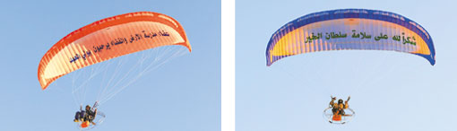 احتفى فريق صقر الصحراء من مدرسة الأرض والفضاء للطيران بعودة صاحب السمو الملكي الأمير سلطان بن عبدالعزيز إلى أرض الوطن بعد رحلته العلاجية وحلق فريق صقر الصحراء بالطيران الشراعي في سماء منطقة الثمامة على ارتفاع 2000 قدم حاملين عبارات التهنئة والتبريكات بسلامة سموه وأعلن الكابتن فهد الزكري عن تقديم استعراضات جوية يوم الاثنين المقبل بمشاركة أكثر من 20 طياراً شراعياً كتعبير حقيقي لمحبة الشباب السعودي لسمو ولي العهد.
