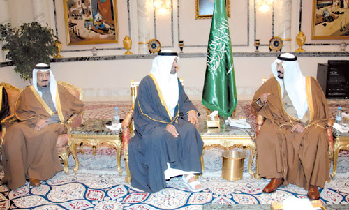 استقبل خادم الحرمين في قصره بالرياض أمس الشيخ محمد بن زايد ولي عهد أبو ظبي نائب القائد الأعلى للقوات المسلحة بدولة الإمارات يرافقه الشيخ حمدان بن محمد آل مكتوم ولي عهد إمارة دبي والشيخ سلطان بن محمد القاسمي ولي عهد ونائب حاكم إمارة الشارقة و الشيخ سعود بن صقر القاسمي ولي عهد