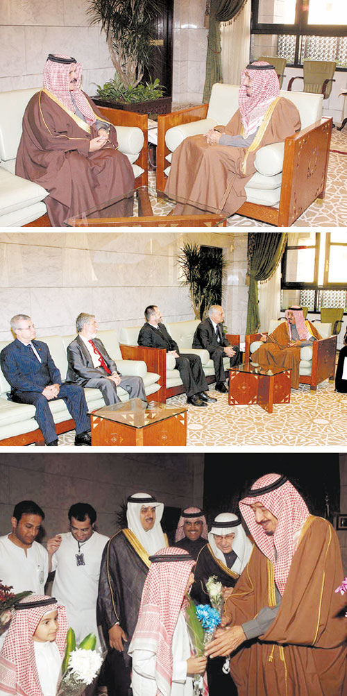 استقبل صاحب السمو الملكي الأمير سلمان بن عبدالعزيز أمير منطقة الرياض بمكتب سموه بقصر الحكم أمس سفراء الدول العربية المعتمدين لدى المملكة والذي قدموا للسلام على سموه بمناسبة عودته لأرض الوطن وتهنئته بسلامة صاحب السمو الملكي الأمير سلطان بن عبدالعزيز ولي العهد نائب رئيس مجلس الوزراء وزير الدفاع والطيران والمفتش العام وشفاء سموه من العارض الصحي الذي تعرض له. وقد شكرهم سموه على مشاعرهم الطيبة والصادقة، وتبادل معهم سموه عددا من الأحاديث الودية.