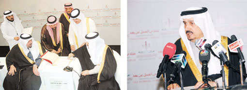 دشن صاحب السمو الملكي الأمير فيصل بن بندر بن عبد العزيز أمير منطقة القصيم رئيس برنامج الأمير فيصل بن بندر بن عبد العزيز للتدريب وتوطين الوظائف مساء أمس الأول انطلاقة فعاليات (منتدى العمل عن بعد - الفرص والتحديات) في مركز الملك خالد الحضاري بمدينة بريدة الذي صدرت موافقة خادم الحرمين الشريفين الملك عبد الله بن عبد العزيز على إقامته، وذلك بحضور سمو نائبه الأمير الدكتور فيصل بن مشعل بن سعود بن عبد العزيز ومعالي وزير التجارة عبد الله بن أحمد زينل المتحدث الرئيس للمنتدى، ومدير عام معهد الإدارة العامة عبد الرحمن بن عبد الله الشقاوي ونائب وزير الخدمة المدنية عبد الرحمن بن عبد المحسن العبد القادر ومحافظ المؤسسة العامة للتدريب التقني والمهني الدكتور علي بن ناصر الغفيص، حيث رأس كل منهم جلسة علمية صباح أمس الأحد وعدد من وكلاء الوزارات المعنية بشؤون العمل وأكاديميين وباحثين ومتخصصين في هذا المجال.